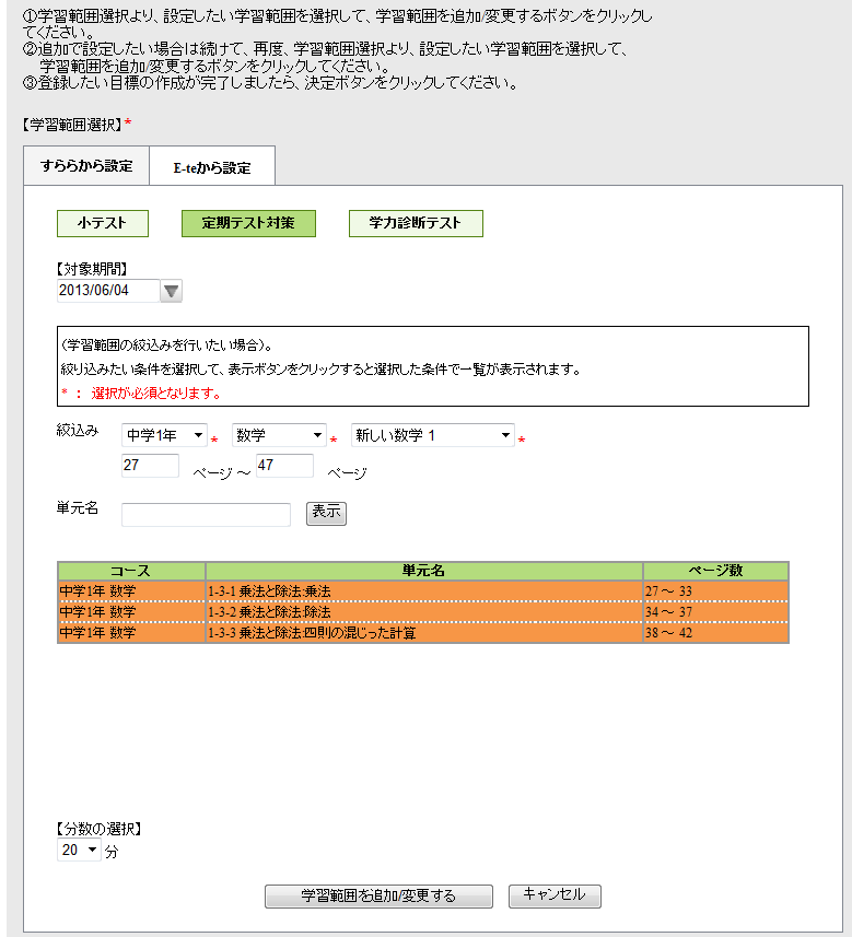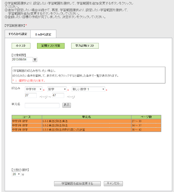 すらら:「期末テスト対策テスト」設定完了