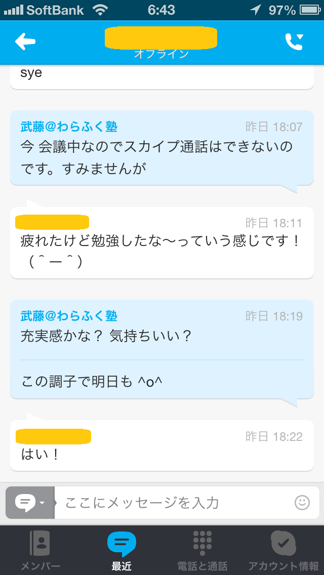 通常のフォローは、時々、スカイプのビデオ通話を使って、顔を見ながら実施し、特に最後には必ず、ビデオ通話で 「がんばったね」のメッセージを送ります。
