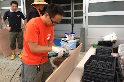 ジャンピングボードとは児童がなわとびの2重跳びの練習で台として使うもの。前回は3年前に作成しましたが、老朽化してきたので、新規に4台、2台を補修しました。