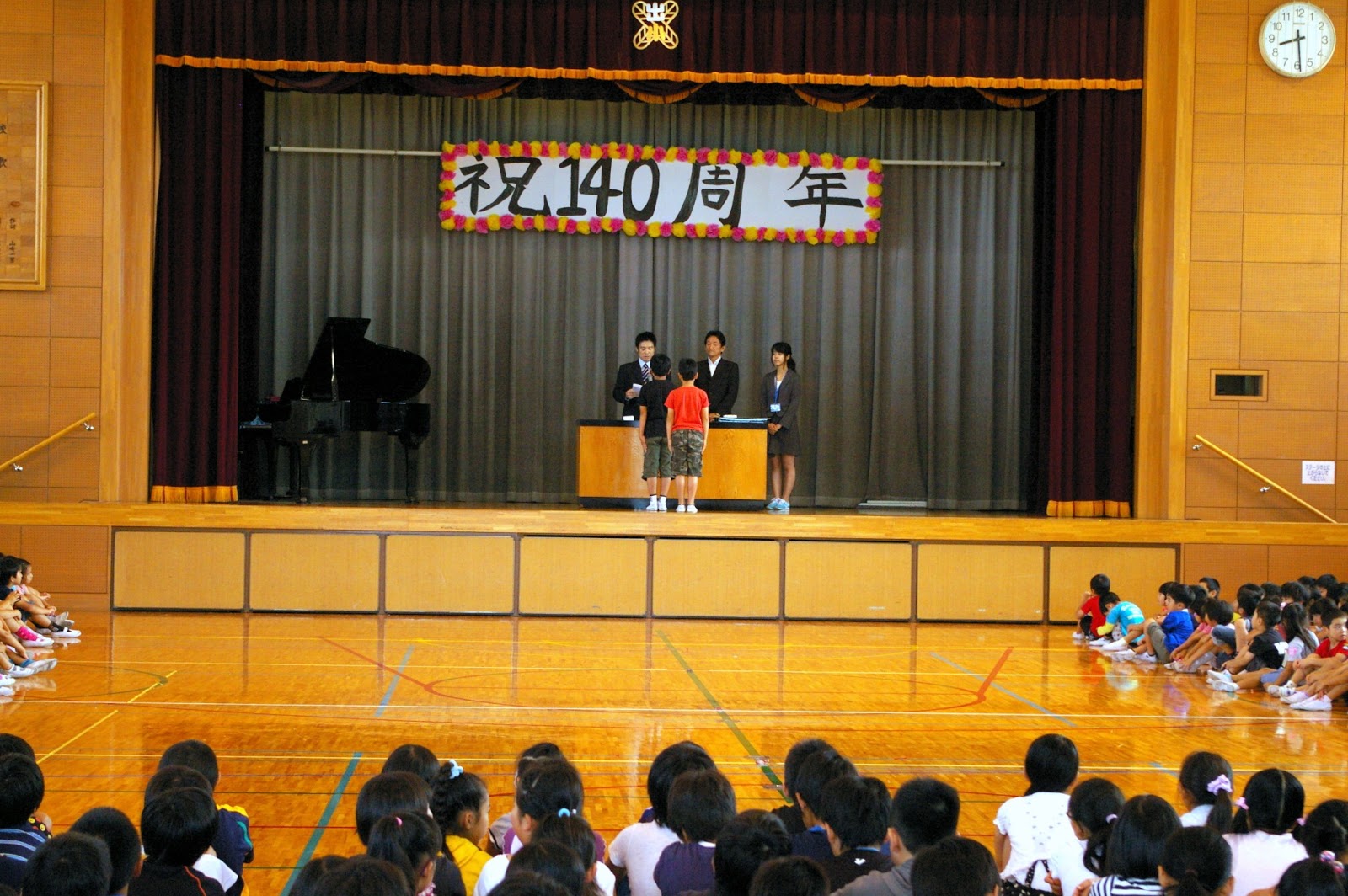 出羽小 開校140周年記念児童集会、笑顔いっぱい (^_^)